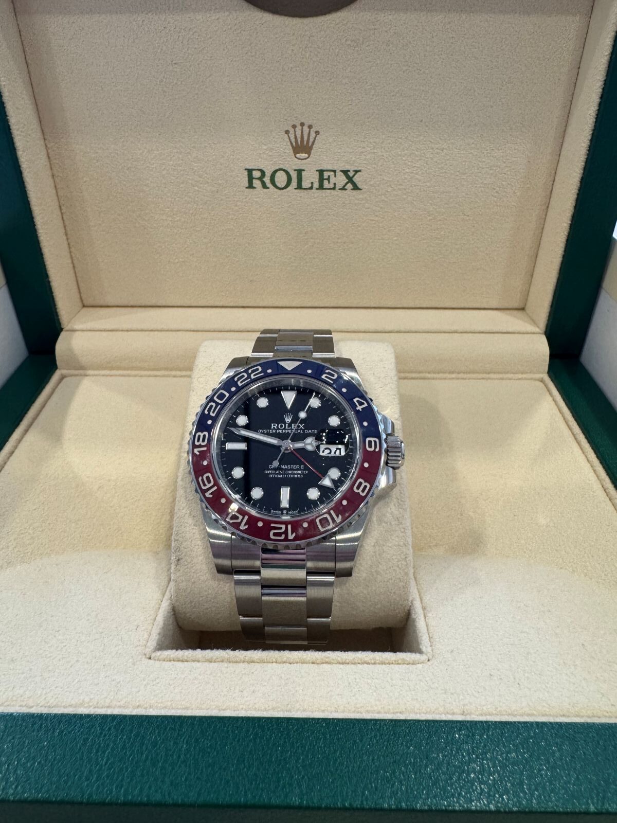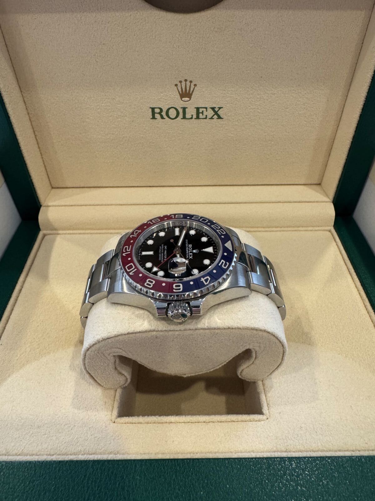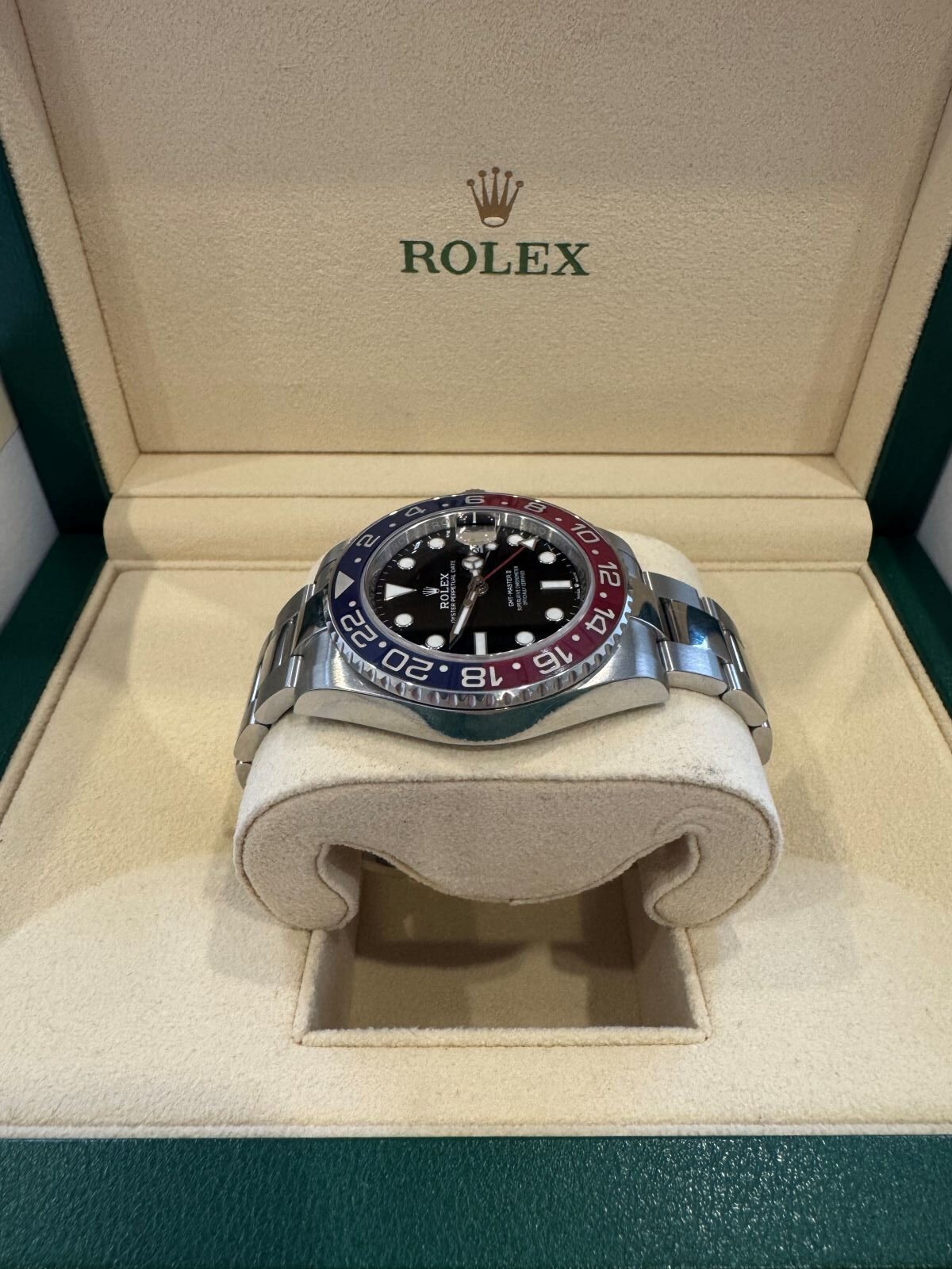 2023 Rolex GMT-Master II 40mm (Ref. 126710BLRO) in stainless steel, automatic movement. Includes box and documents.