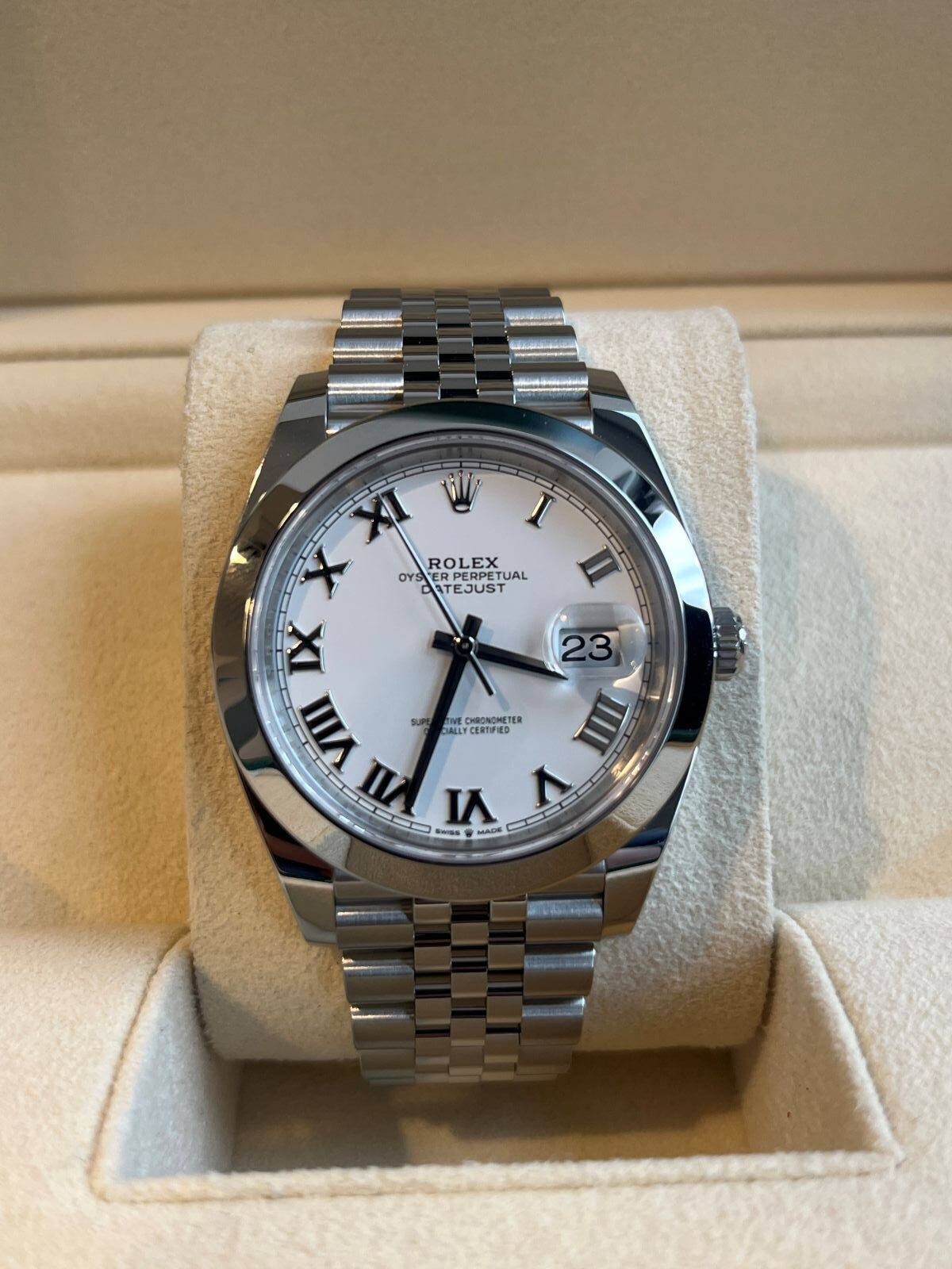 2026 Rolex Datejust 41 (Ref. 126300) with white Roman dial, 41mm stainless steel case and bracelet, powered by the Caliber 3235 automatic movement. Brand new, complete with box and papers.