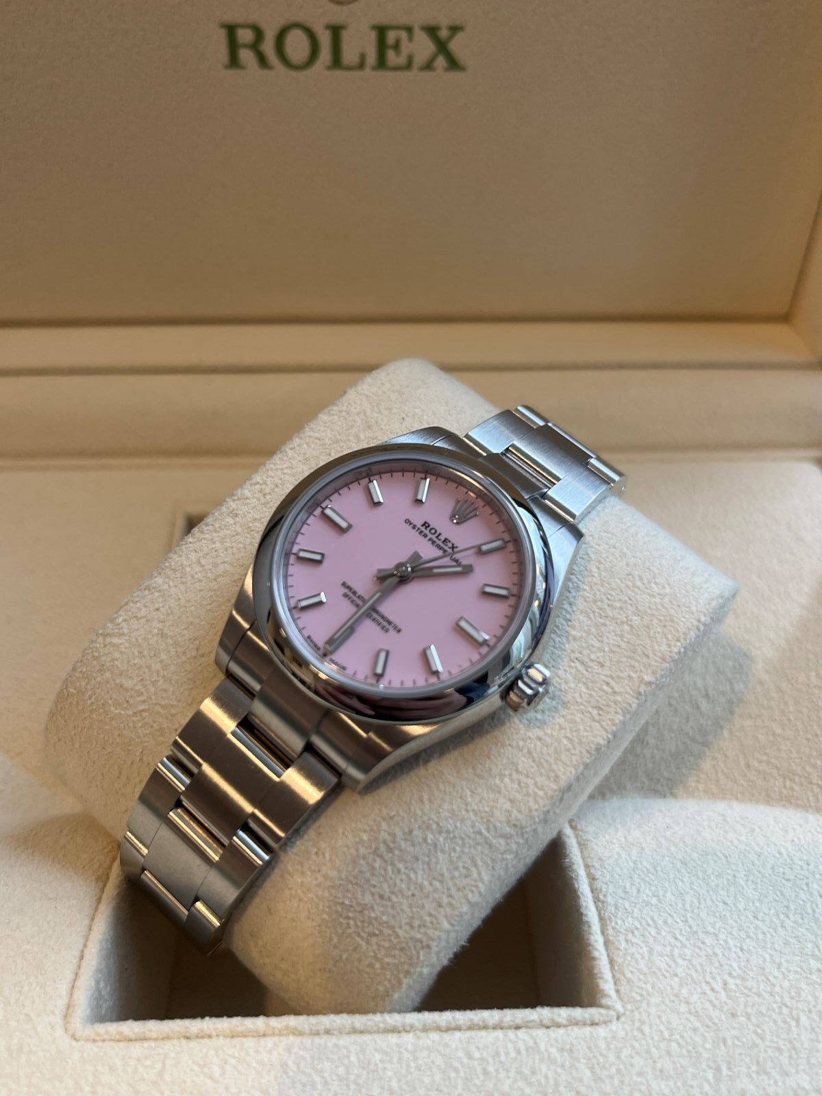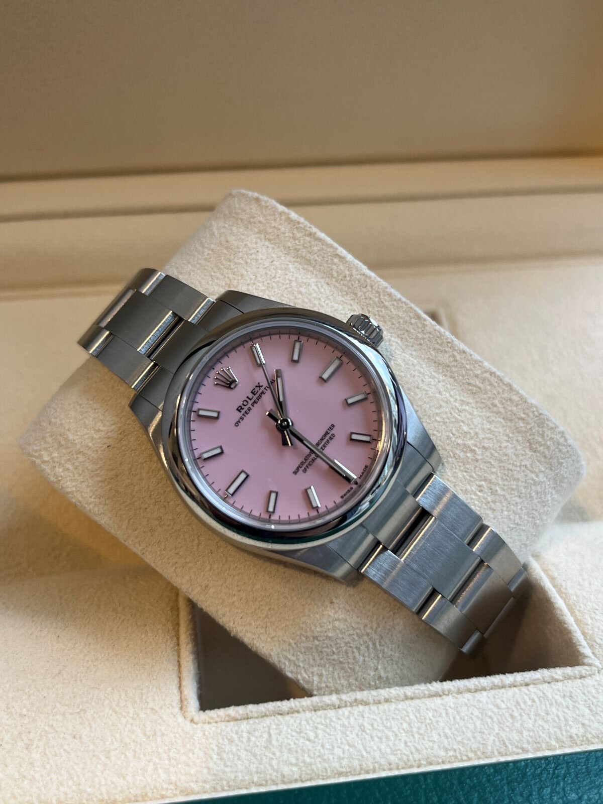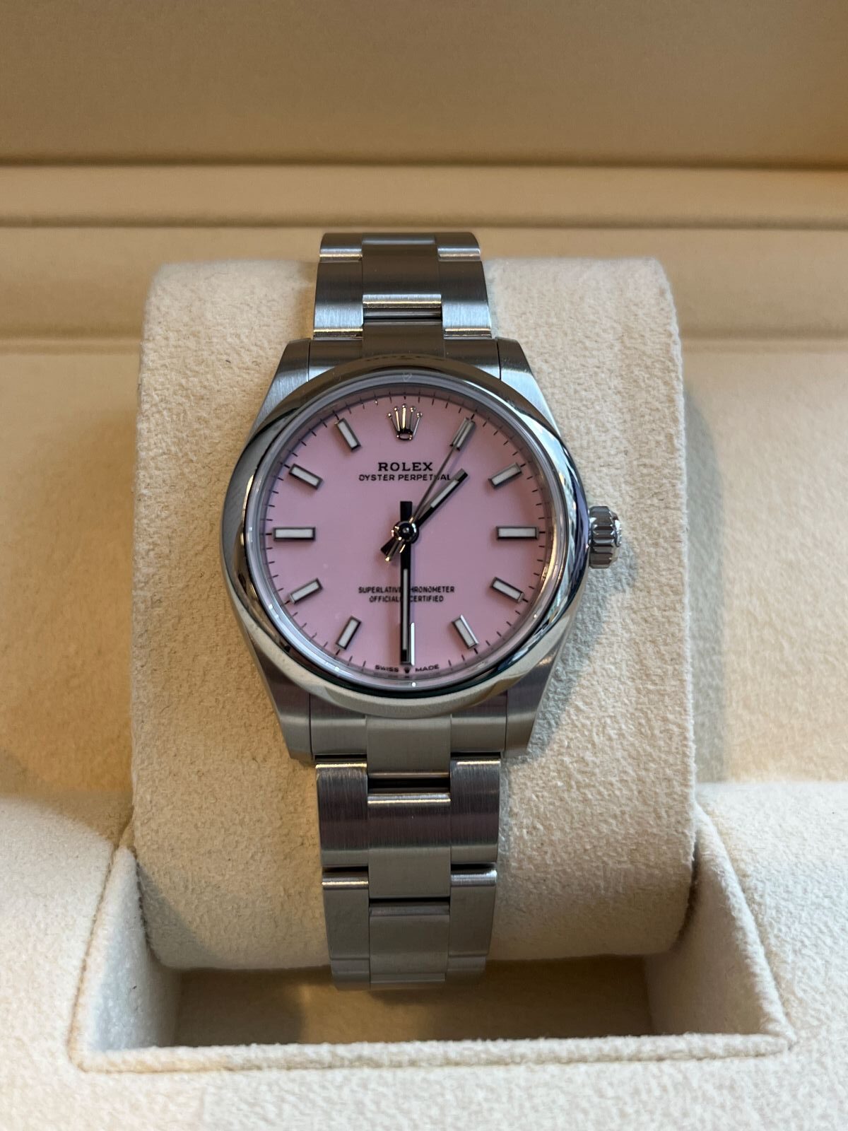 2025 Rolex Oyster Perpetual 31 (Ref. 277200) in stainless steel with candy pink dial, 31mm case, automatic Caliber 2232. New, box and papers.