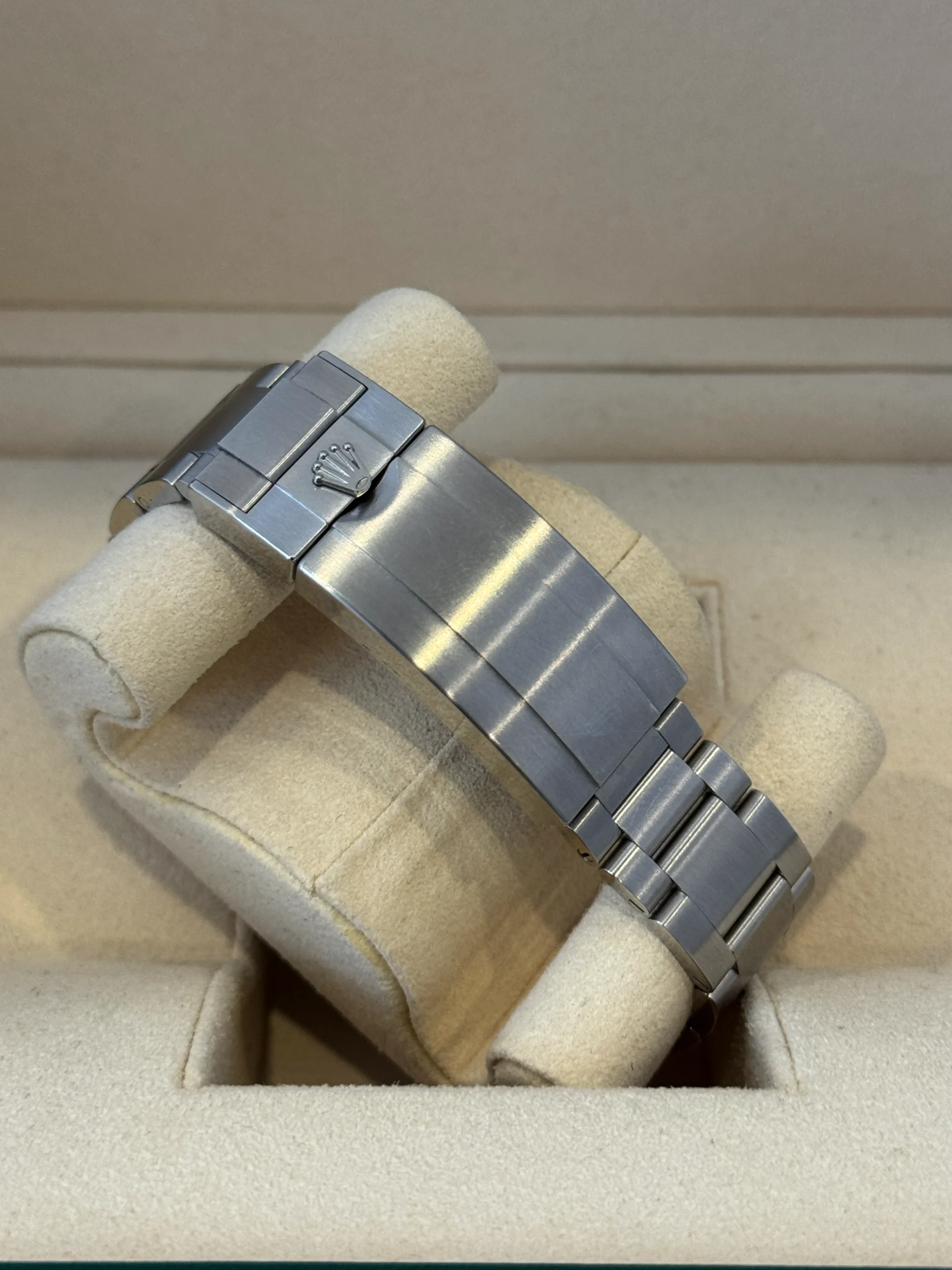This 2025 Rolex Submariner (Ref. 126610LV), also known as the “Starbucks” or “Cermit,” features a 41mm stainless steel case with a striking green ceramic bezel and matching stainless steel Oyster bracelet. Powered by an automatic movement, it offers legendary precision, durability, and water resistance. In excellent used condition, and complete with its original box and documents, this iconic diver’s watch is a standout modern classic.