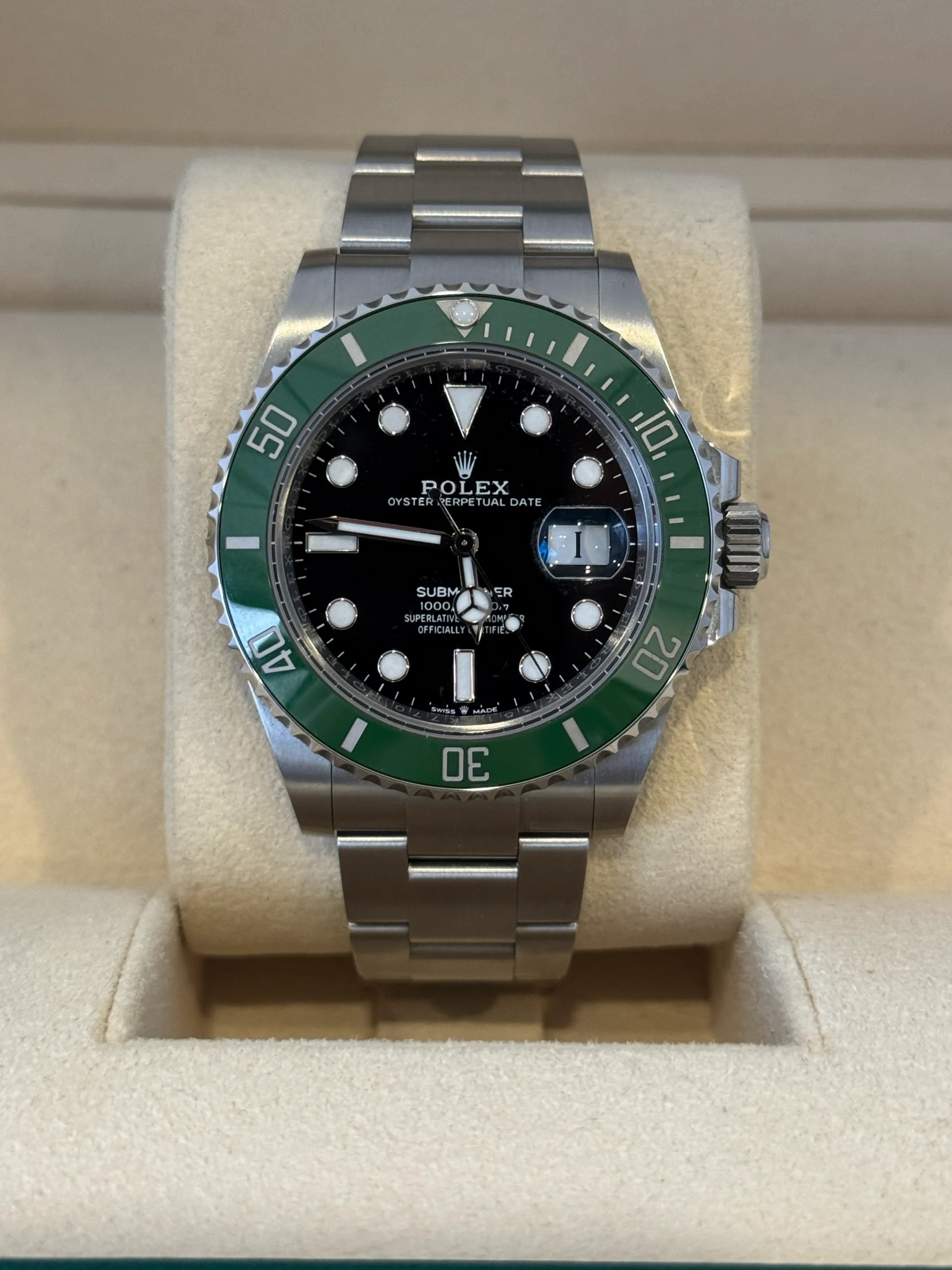 2025 Rolex Submariner 41mm (Ref. 126610LV) in stainless steel, automatic movement. Includes box and documents.